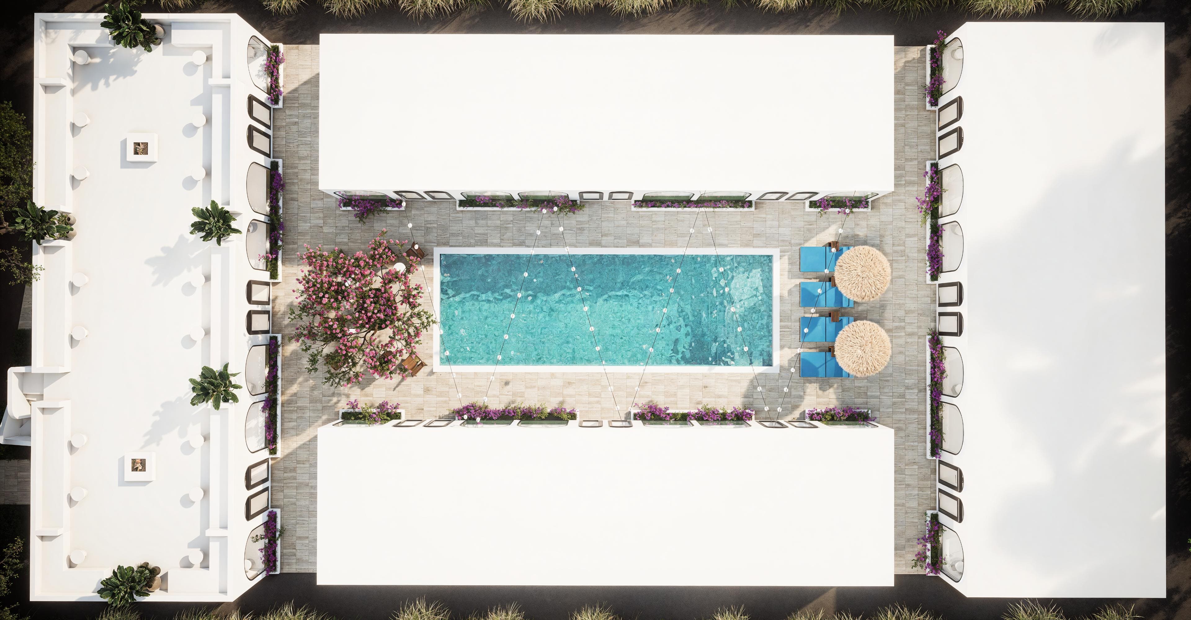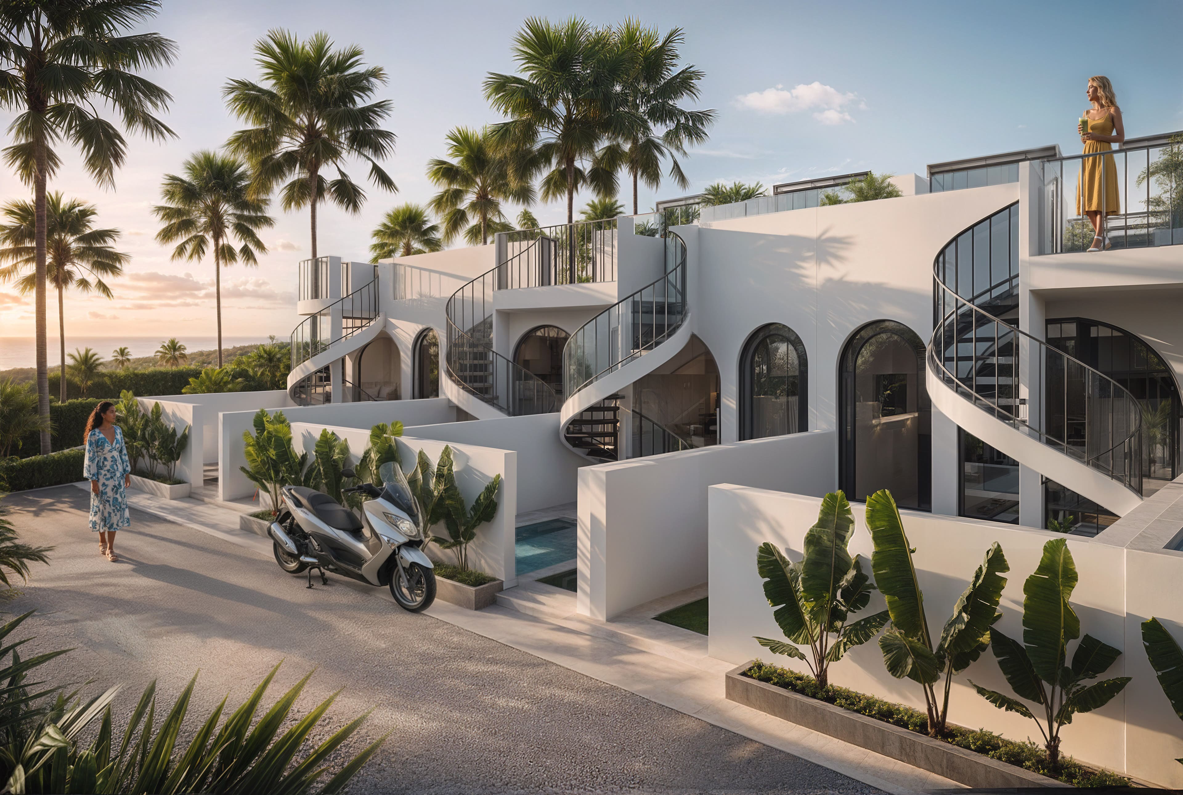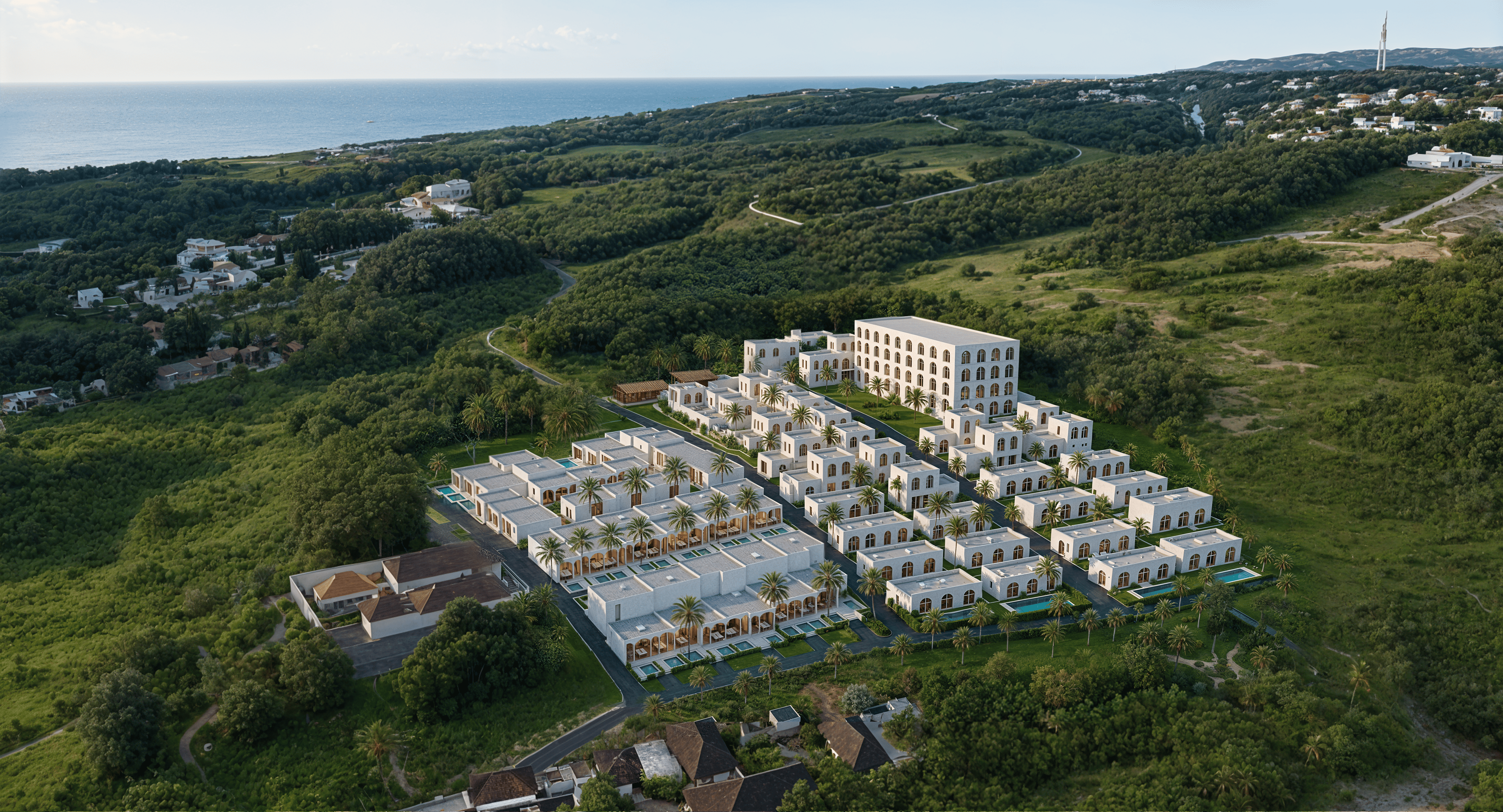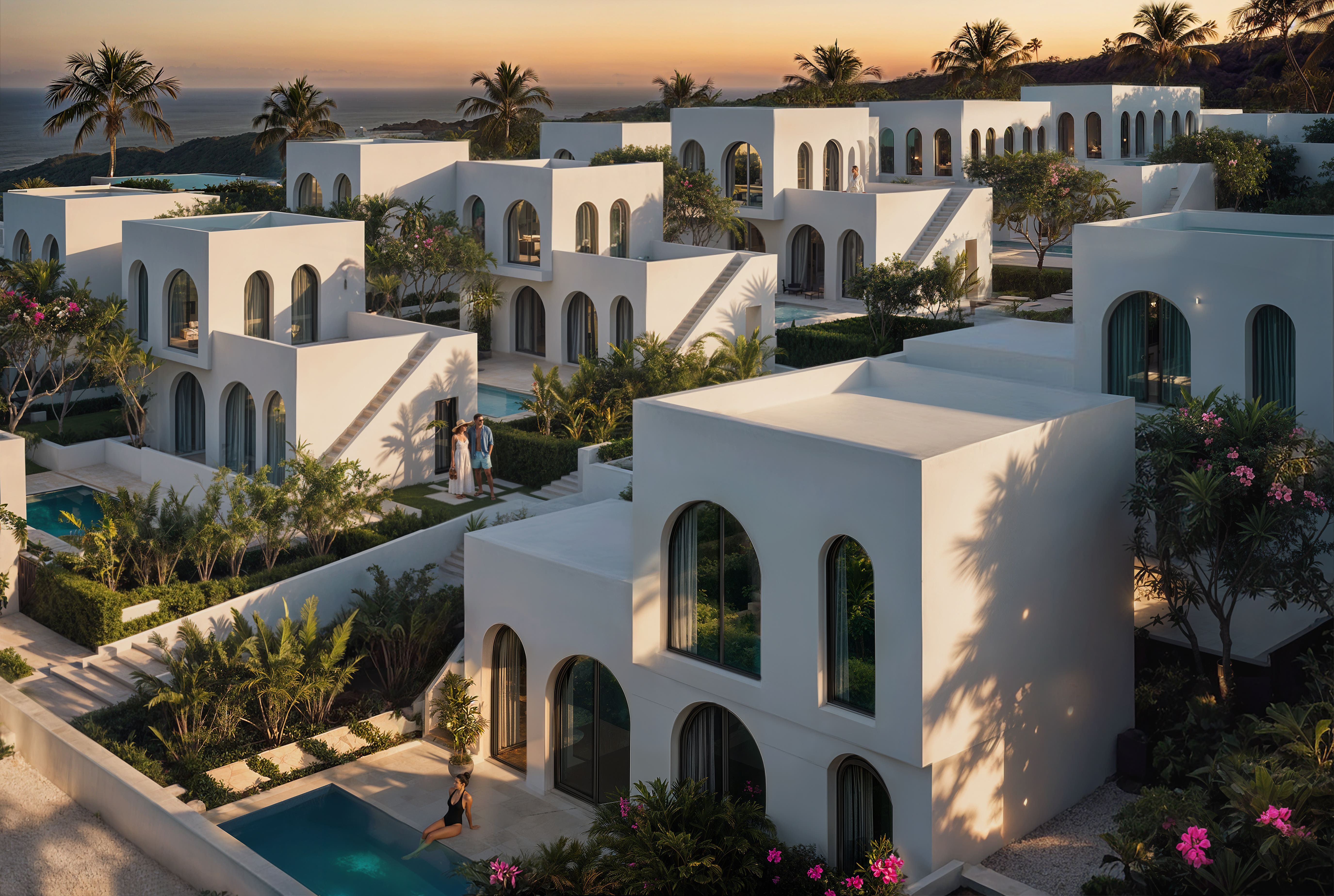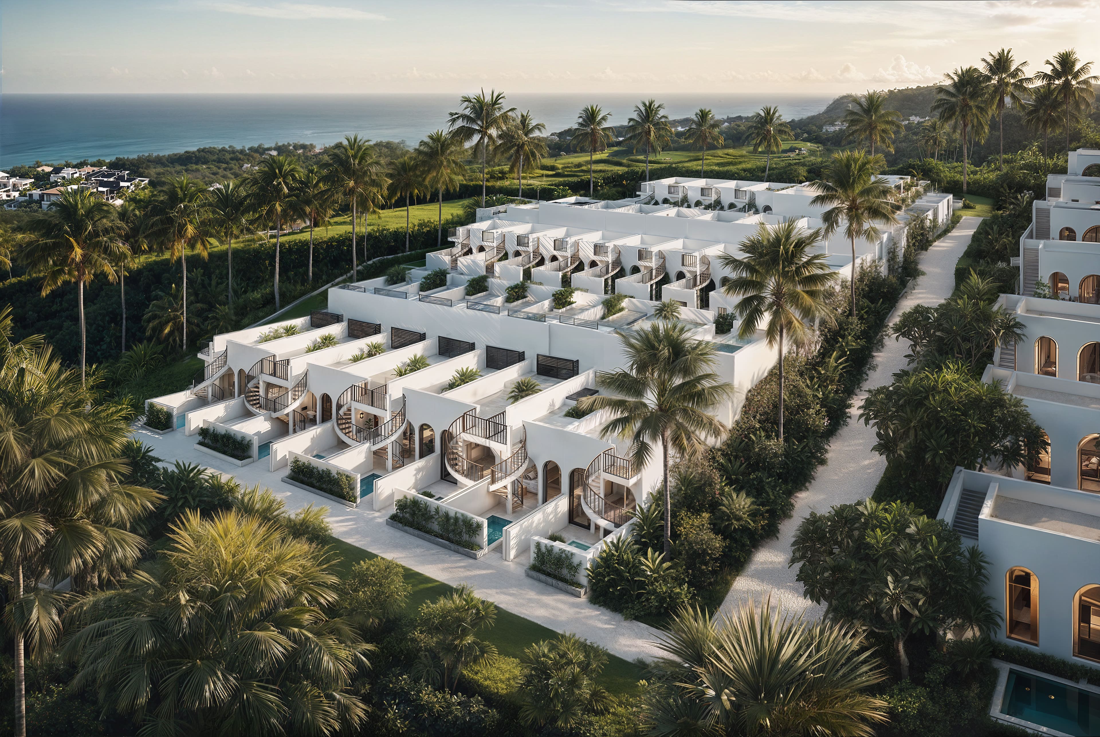 Белоснежные фасады, арки и пропорции в духе Санторини. Чистая геометрия, панорамные руфтопы, гармония света и пространства.