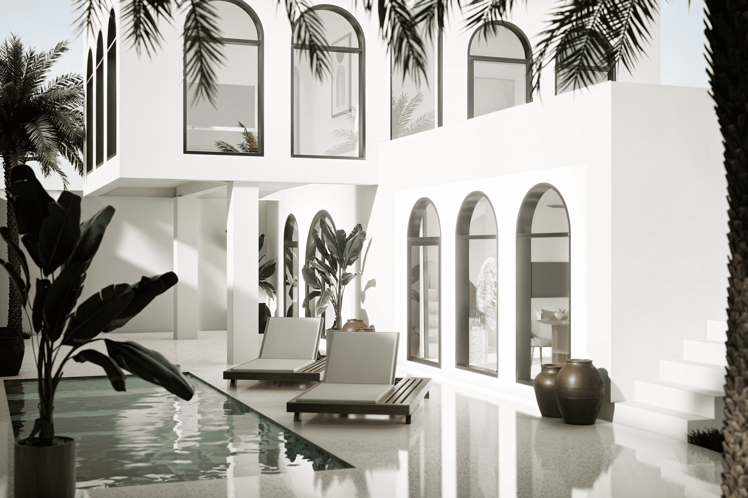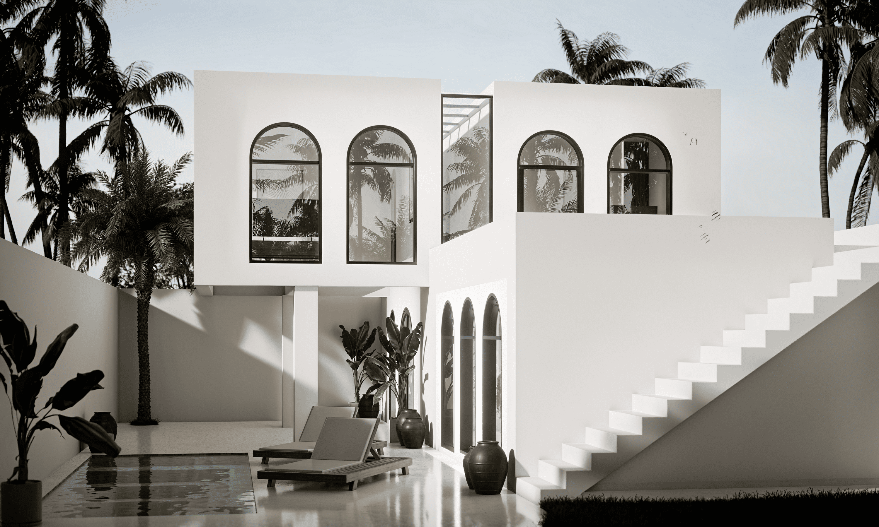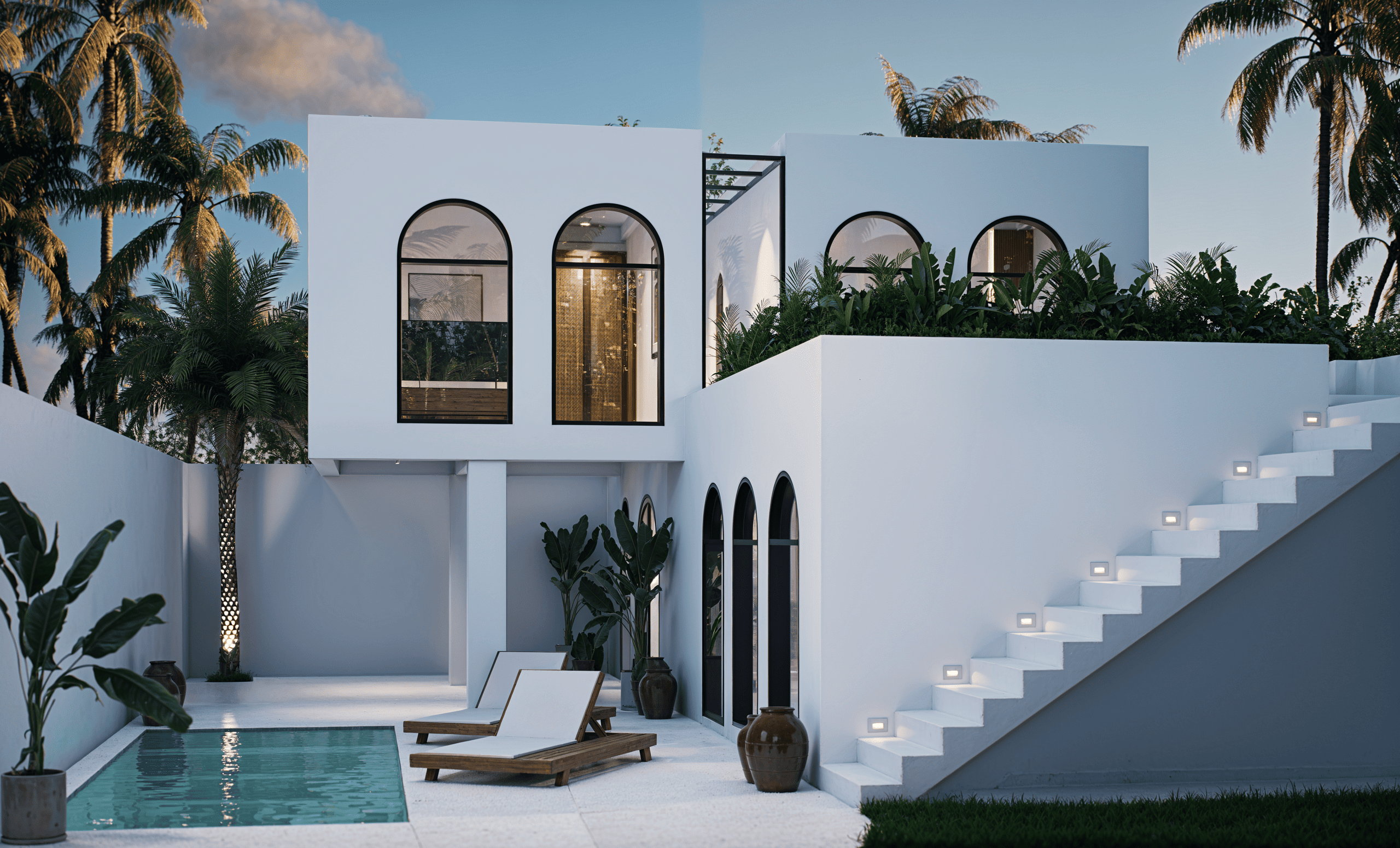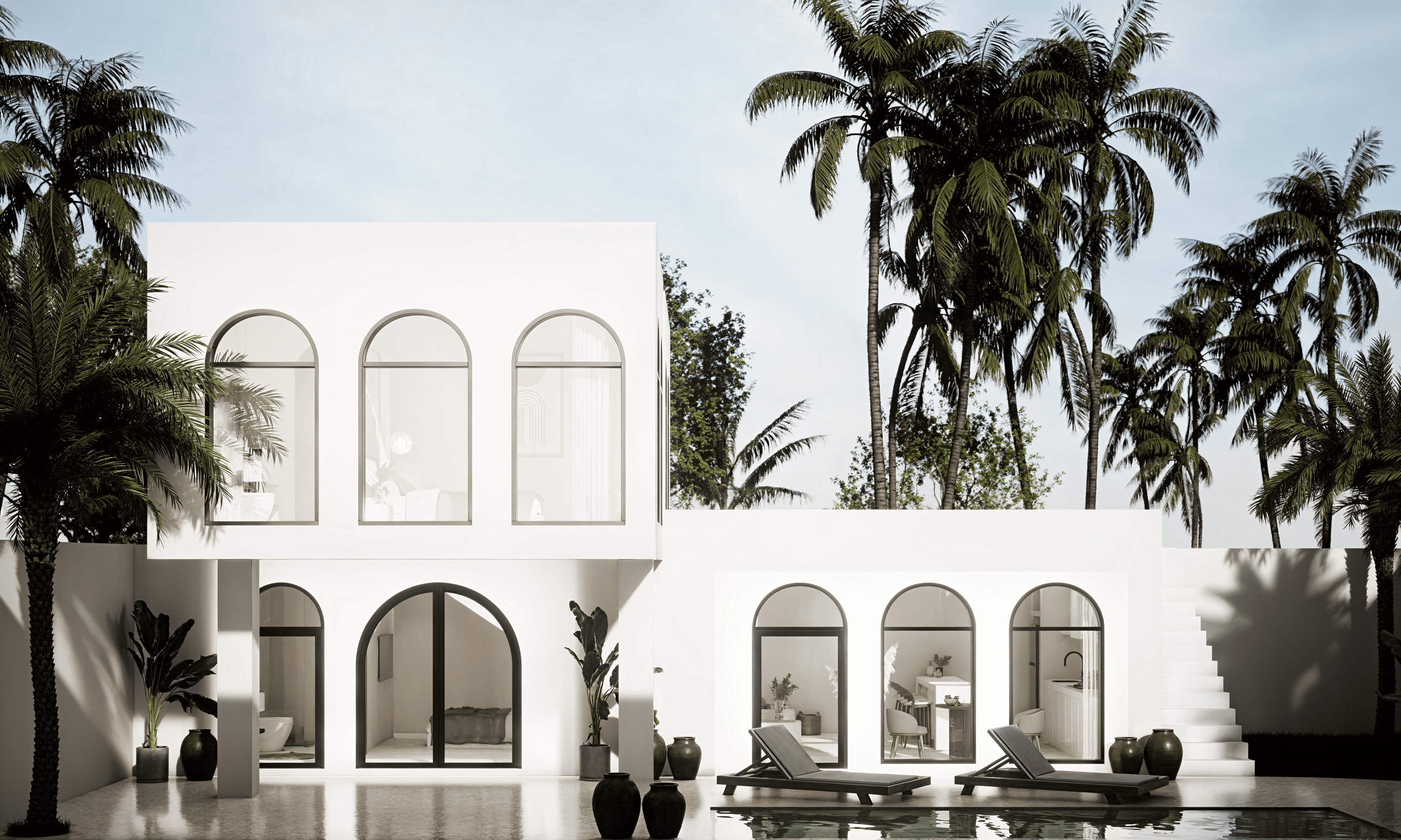 Белоснежные фасады, арки и пропорции в духе Санторини. Чистая геометрия, панорамные руфтопы, гармония света и пространства.
